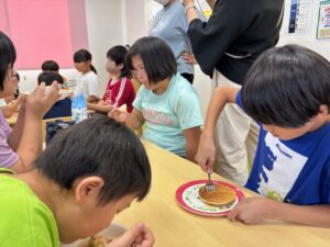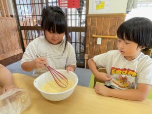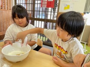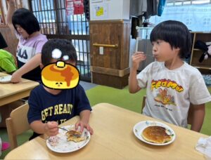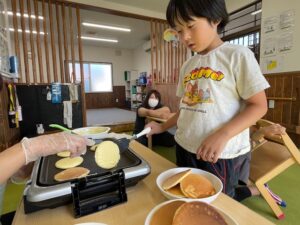 楽しんで作っていました♪おやつにはみんなでお誕生日を祝いながらホットケーキを食べました☆