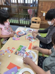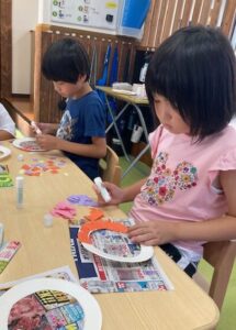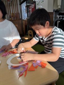 来月のハロウィンに向けてみんなで制作をしました!第一回目は紙皿に千切った画用紙を張り付ける作業でみんな楽しんで制作に取り組んでいました🎃