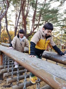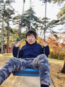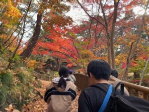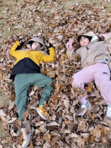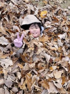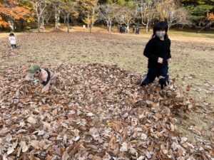 香雪園では綺麗に色づいた紅葉を眺めながらゆっくりと散歩をして公園まで移動しました🍂その後は遊具や落ち葉のある広場で自由に遊びました!大量の落ち葉をみんなで集めては山を作って飛び込んだり、ベットを作って寝ころんだ後に落ち葉の毛布でくるんだりと秋ならではの楽しみ方を探して遊んでいました!
