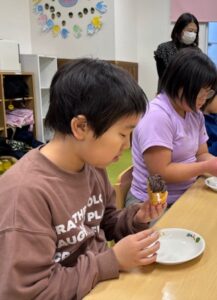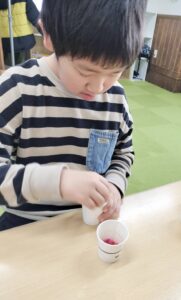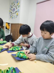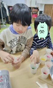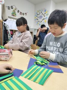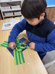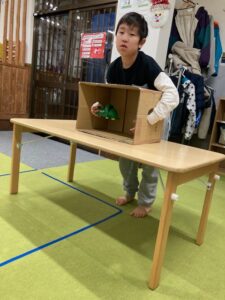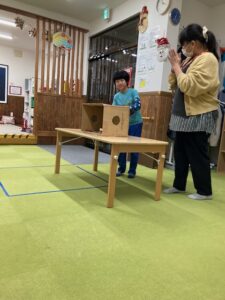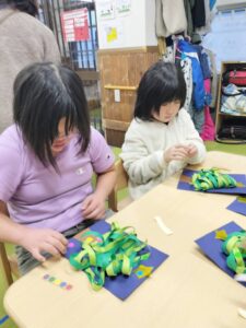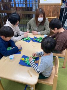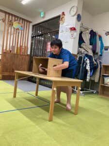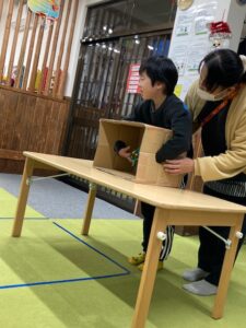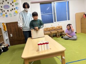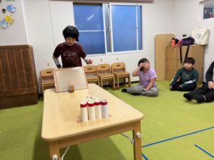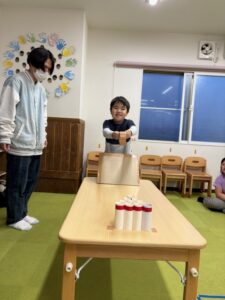 室内活動が多くなってきましたが物当てゲームや、椅子取りゲーム、ボーリングなどの設定遊びを取り入れながら室内でも楽しく過ごしています♪課題では苦手な事にもスモールステップで取り組めるように頑張っています☆