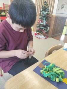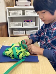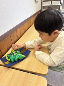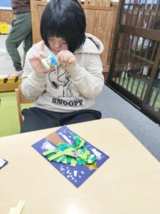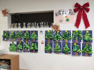 ツリーは緑の部分を自分で考え指先で捻ったりしてシールで飾りつけして雪を絵の具でつけました☆とっても素敵な飾りが出来ましたよ💕