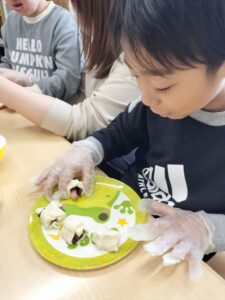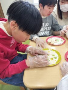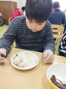 2月の主役からのおやつリクエストはチョコバナナパイ🍌甘いのが苦手な子もいるので、ウインナーとチーズも用意して4つずつ思い思いに挟んでクルクルしました♡なかなか好評で「おかわり!」の声が多く予備分もすぐに完売していました!