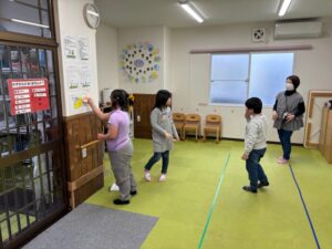 室内で過ごす日には、集団での活動として15分程度の設定遊びを設ける日が多いです!写真は宝探しをしている場面です☺決められたルールを守ること、チームの仲間のことを考えることなど短い時間ですが、成長したなーと思う部分やここはまだ課題だなーと感じる部分などがたくさん見えます👀