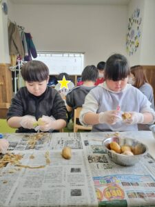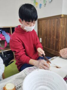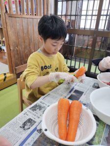 今回のクッキングはただのカレーではなくカレーうどんにしてみました!皮をむいたり切ったりするのは手慣れていて、楽しみながらもすぐに終わらせることが出来ました!はじめてのカレーうどんでしたがみんなおいしそうに食べていました🍛